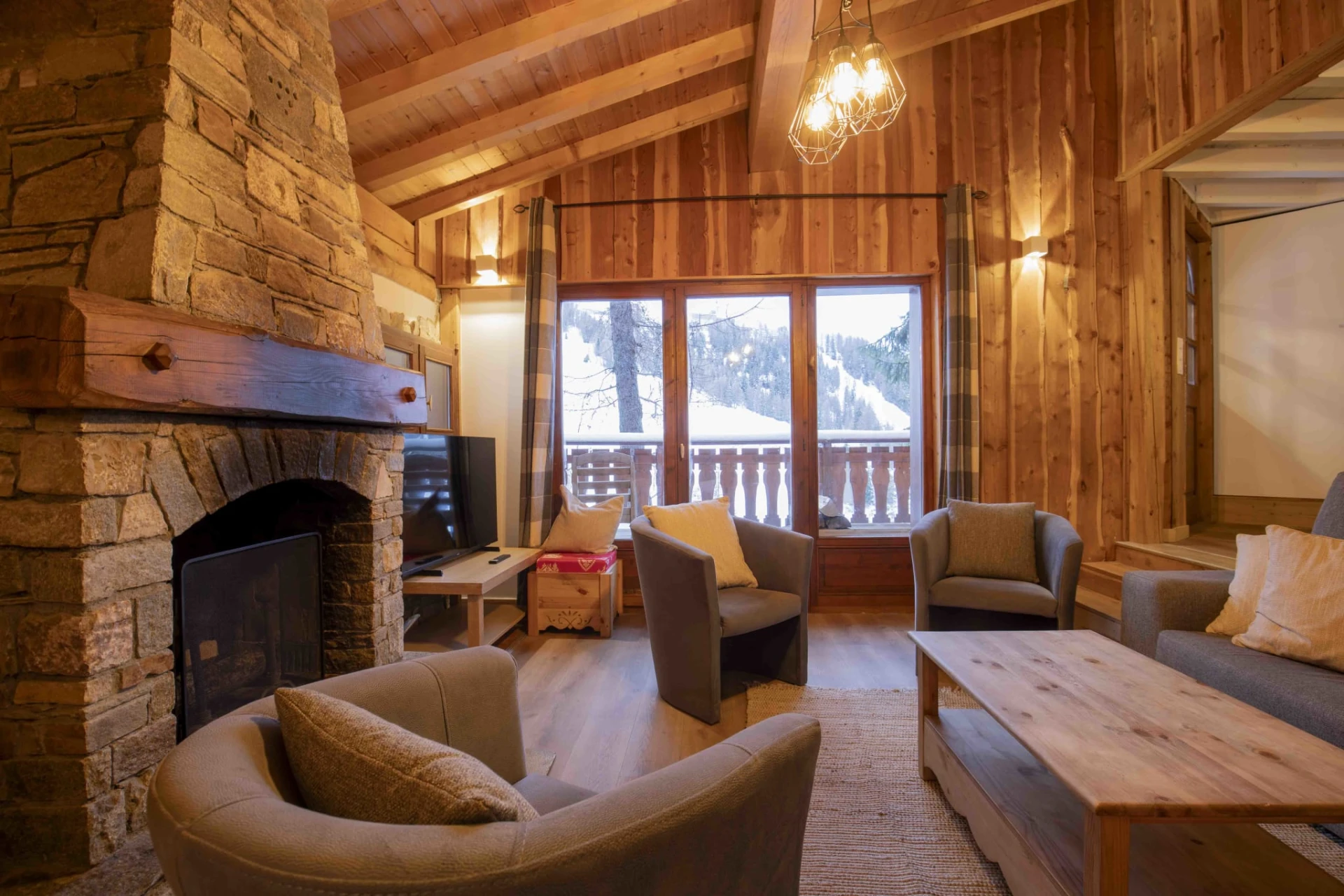 Un vaste salon avec cheminée et télévision, ouvrant sur un grand balcon exposé sud-ouest.