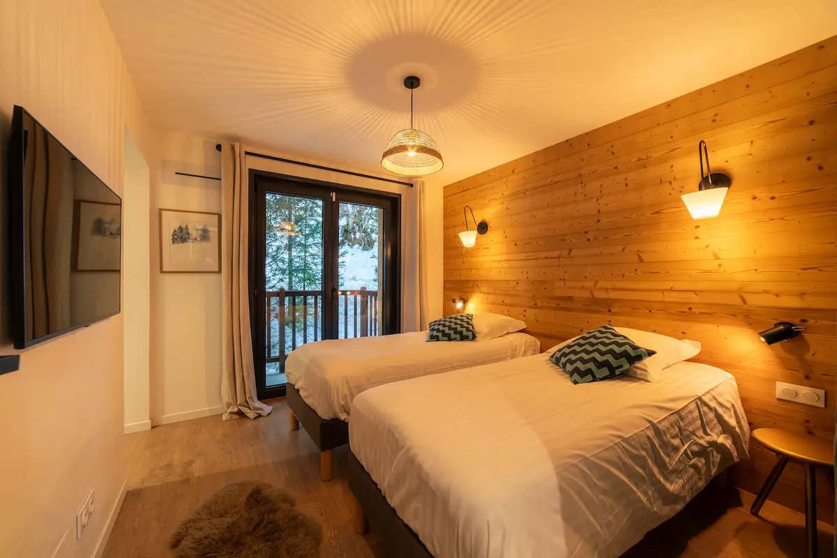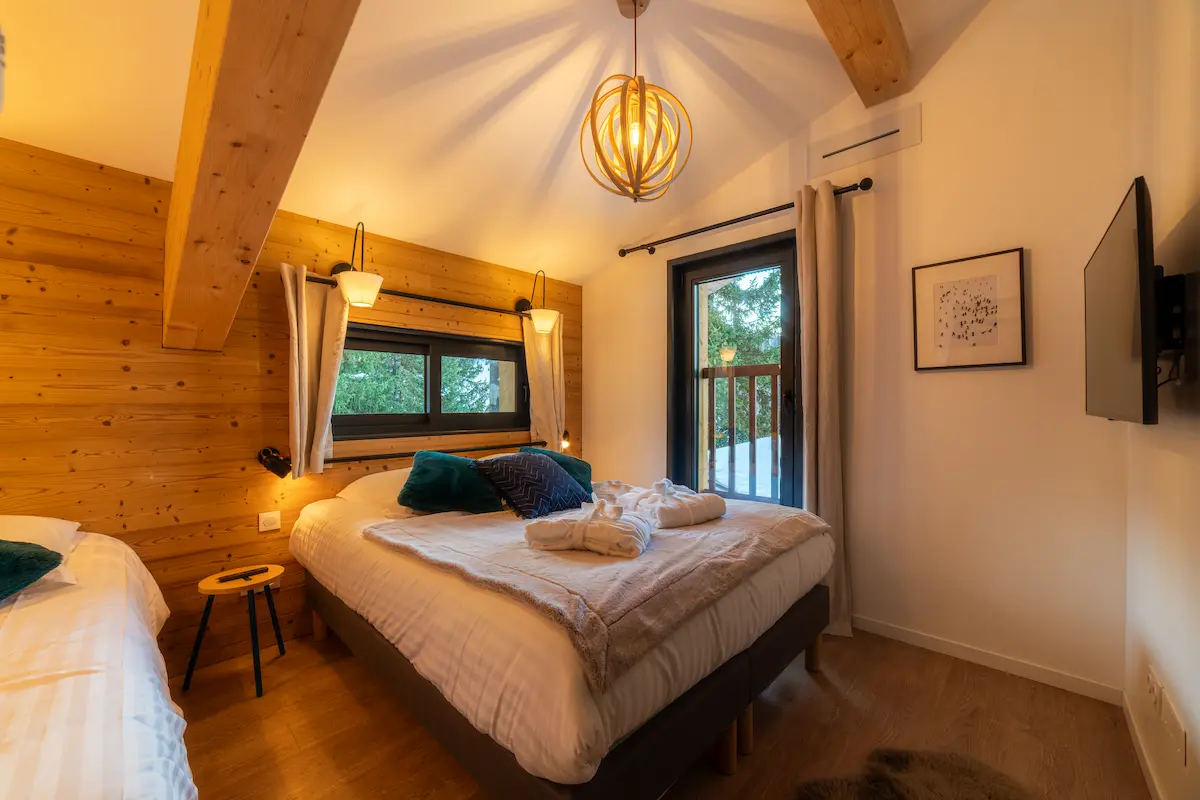 Chacun pourra disposer de son intimité avec 7 chambres toutes en suite avec salles de bain. Deux chambres de maître spacieuses sont en suite avec une salle de bain avec doubles vasques et baignoire. La literie haut de gamme apportera confort à vos nuits. Chaque chambre dispose d’un balcon ou terrasse avec une jolie vue sur la montagne ou la forêt enneigée. Toutes les chambres sont équipées de télévisions.