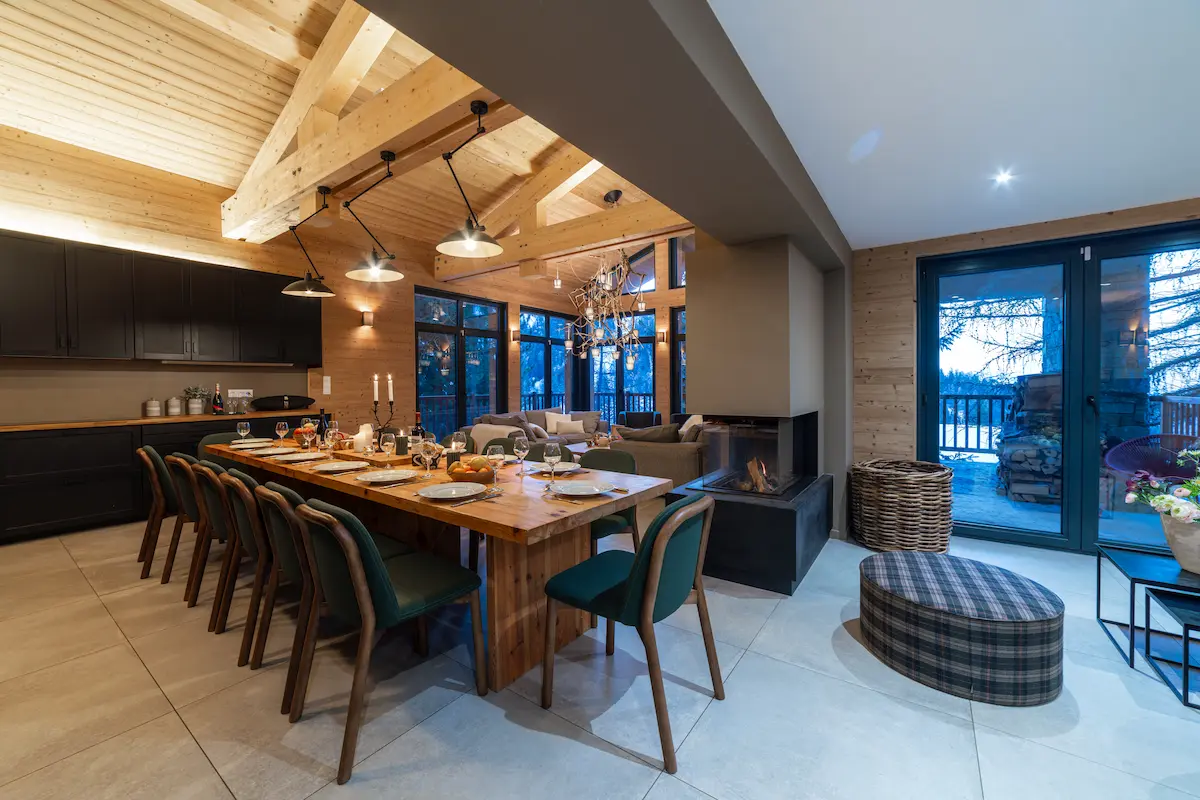 Le toit cathédrale avec la charpente apparente, les larges baies vitrées et le lustre spectaculaire donne un cachet unique au grand salon. Il vous permettra de profiter d’un environnement ressourçant et lumineux avec une superbe vue sur la montagne et les sapins enneigés. La chaleur du bois intérieur, les canapés moelleux et la cheminée design à trois faces vitrées vous offriront des moments de détente inégalés.
